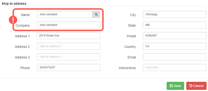 NOTE: If the order has been processed, you won't be able to make changes. In that case you will have to void the order before making changes. - Verify (and edit if necessary) that there is no duplicate information within the Ship to Address section. If you make changes, press Save.