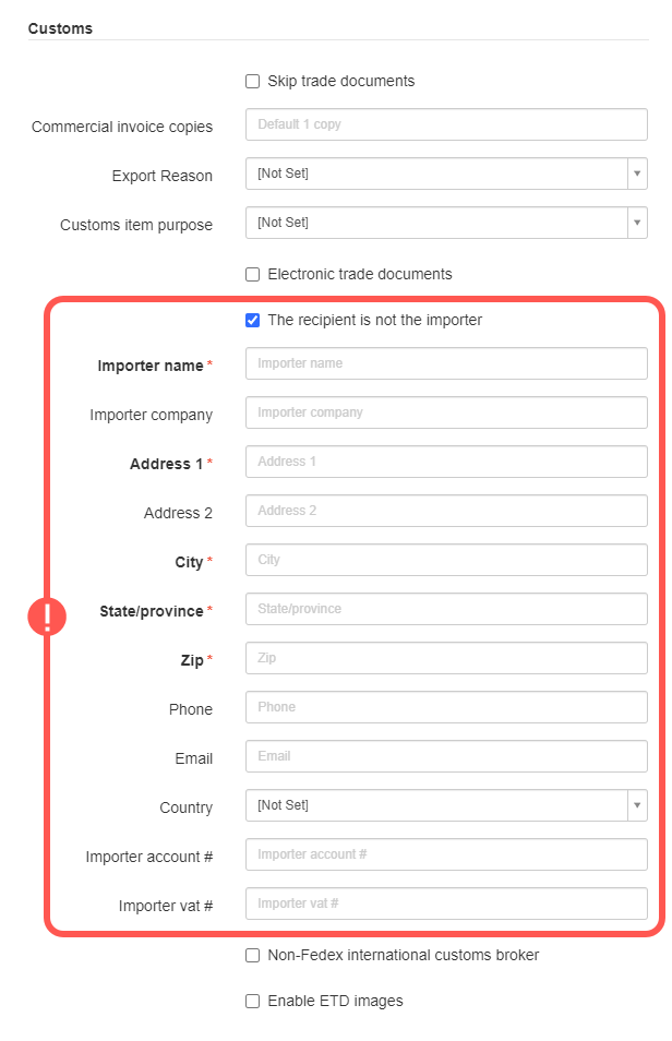 - The Recipient is not the importer: If checked, additional fields will be displayed to specify the Importer account number and details.