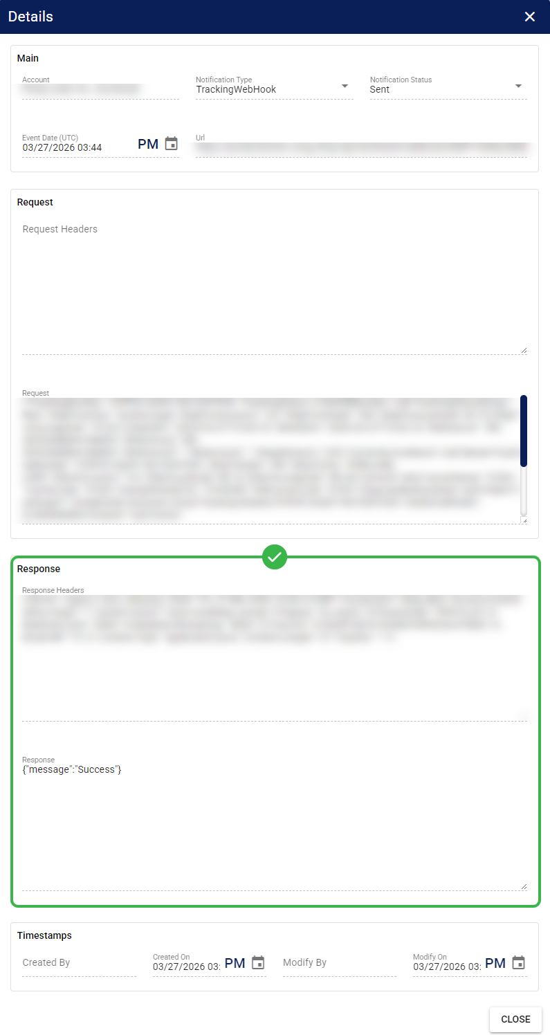 The Notification Logs record the status of all sent webhooks. Use this section to find and examine a specific entry for troubleshooting, testing, and debug analysis.