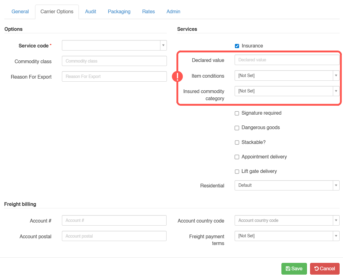 The Carrier Options tab allows to set up basic and advanced features of your Worldwide Express (LTL) billing account.
