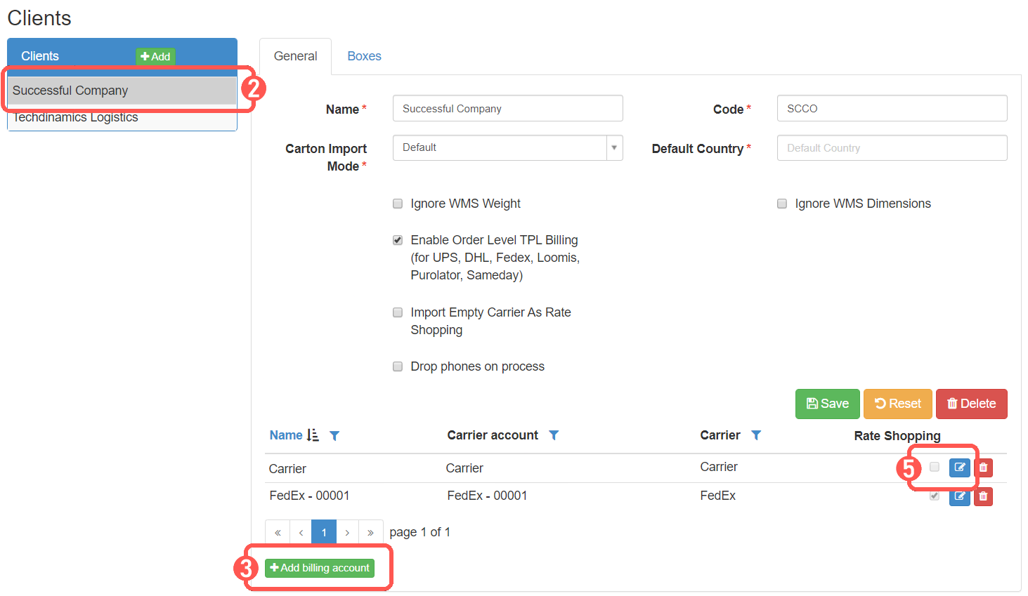 When setting Billing Accounts, you will be able to specify how it should work for that specific client, setting label references, packing slips usage, rate shopping, markups, WMS information updating and Carrier options such as the default service level, address validation, sender and return addresses, etc.