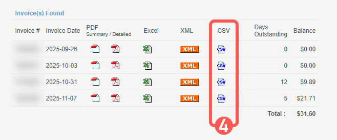NOTE: The process for obtaining invoice files is managed directly by each carrier and may change at any time. Always confirm the latest procedure with your carrier's agent or support team.To download the Canpar invoices: