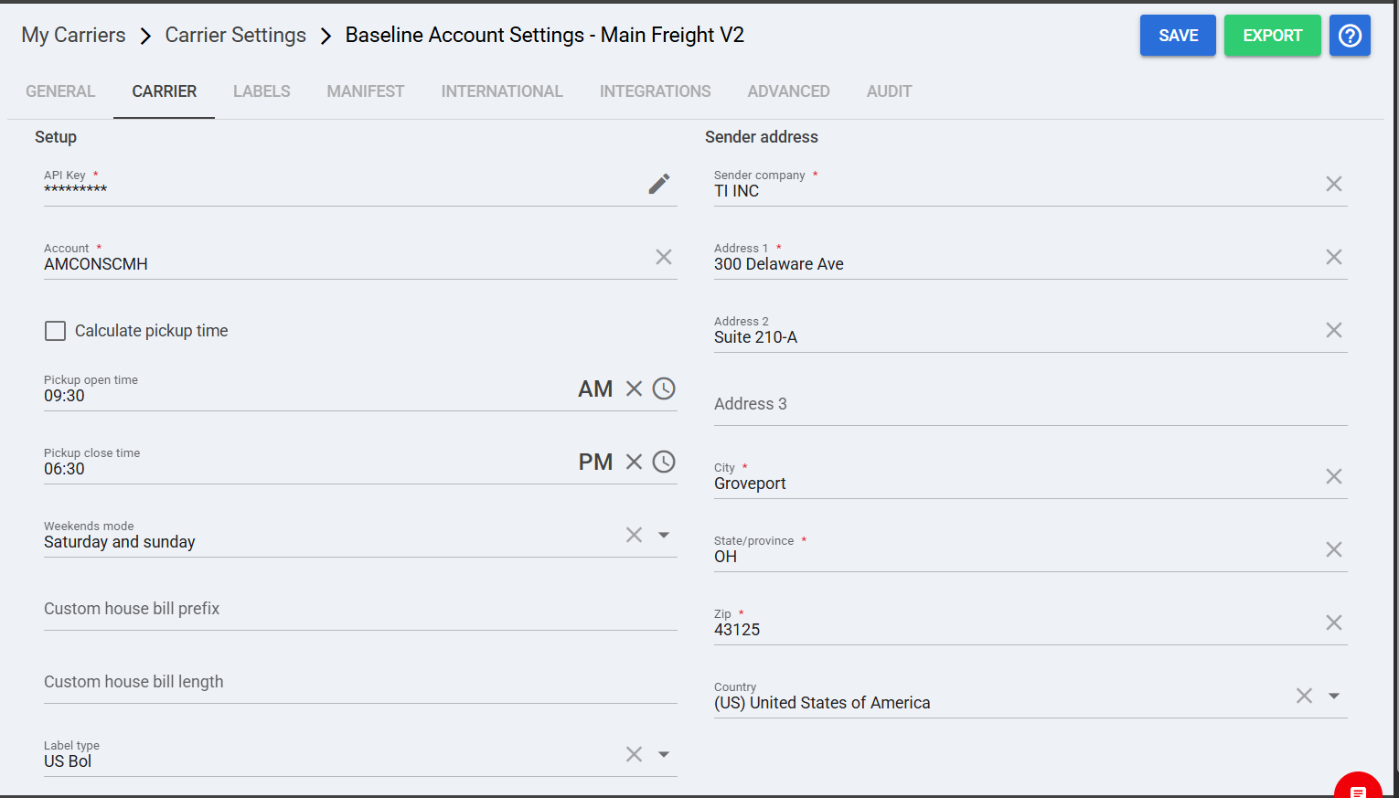 A Baseline Carrier Account defines the default configuration required for the platform to communicate with the carrier and generate shipping labels. This setup is required before adding Client (Billing) Accounts and enabling shipping operations for this carrier.