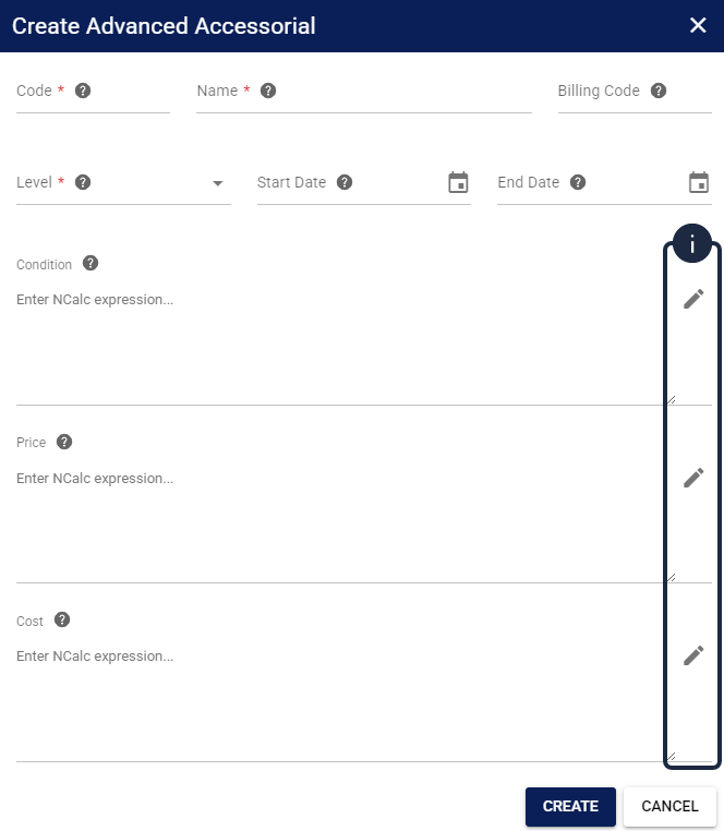 ![]() | Under the Advanced tab, press Create to define highly custom logic. In this section, your Condition, Price, and Cost fields can all be dynamically evaluated using mathematical expressions. |